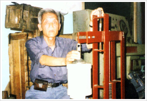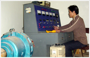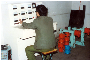 節(jié)能制動(dòng)器創(chuàng)始人張家政先生(左一)在北京起重運(yùn)輸機(jī)械研究所實(shí)驗(yàn)臺(tái)上進(jìn)行檢測